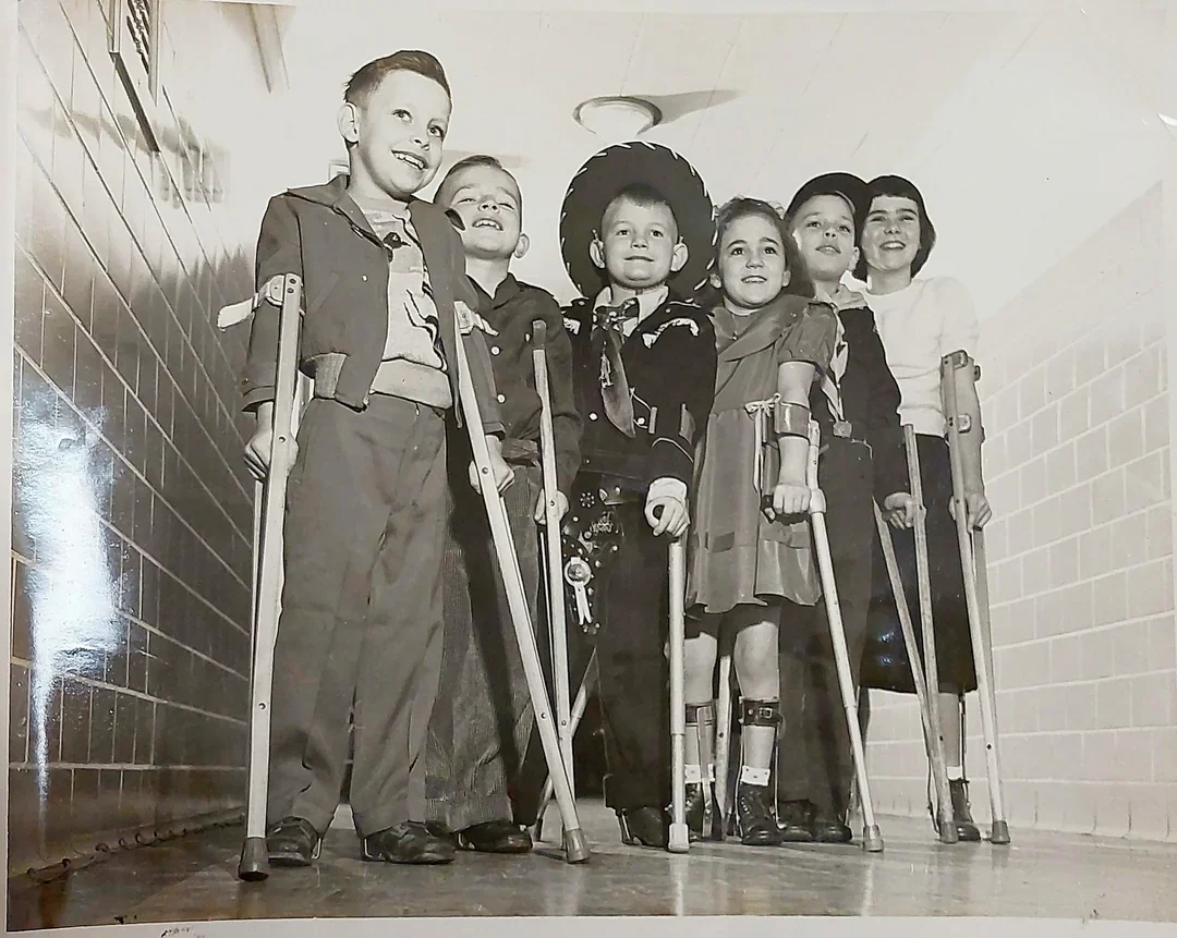 Children with polio learning to walk with the aid of a special support, 1955. Kenny’s methods of movement and rehabilitation stood in sharp contrast to the immobilization practices of the time.